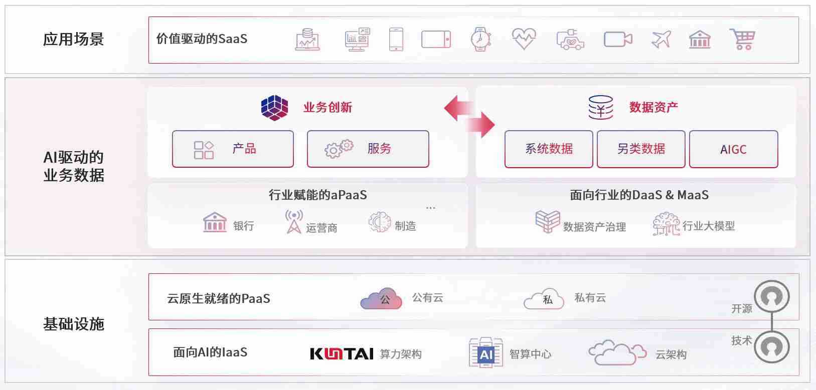 数字时代,,围绕企业数字化转型的关键要素,,,伟德bv1946数码开创性的提出数云融合战略和技术体系框架,,,着力在云原生、、、、数字原生、、AI原生和信创产业上架构产品和服务能力,,,为处在不同数字化转型阶段的快消零售、、汽车、、、、金融、、、医疗、、政企、、教育、、运营商等行业客户提供泛在的敏捷IT能力和融合的数据驱动能力,,构建跨界融合创新的数字业务场景和新业务模式,,助力企业级客户建立面向未来的核心能力和竞争优势,,,全面推动社会的数字化、、、智能化转型升级。。